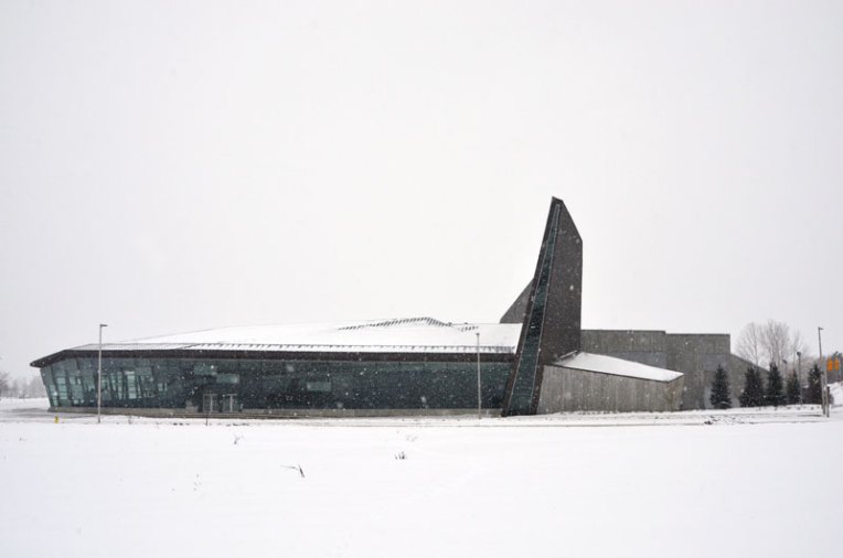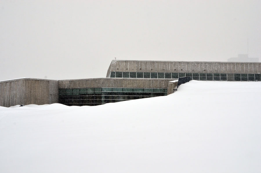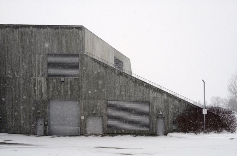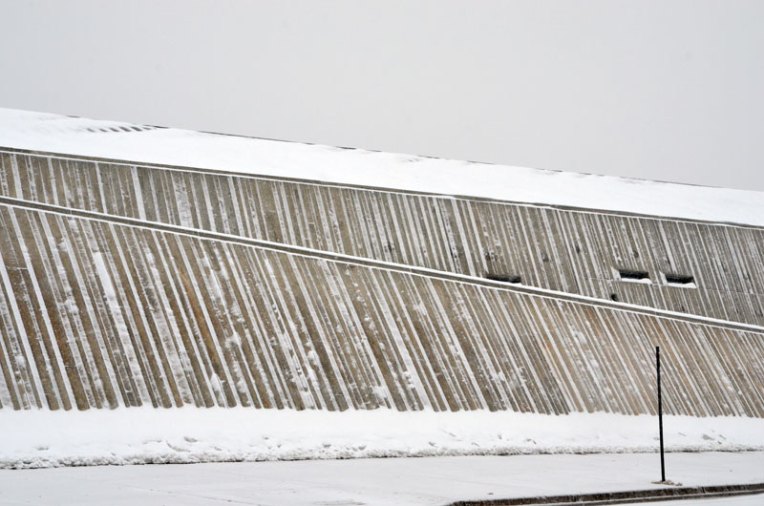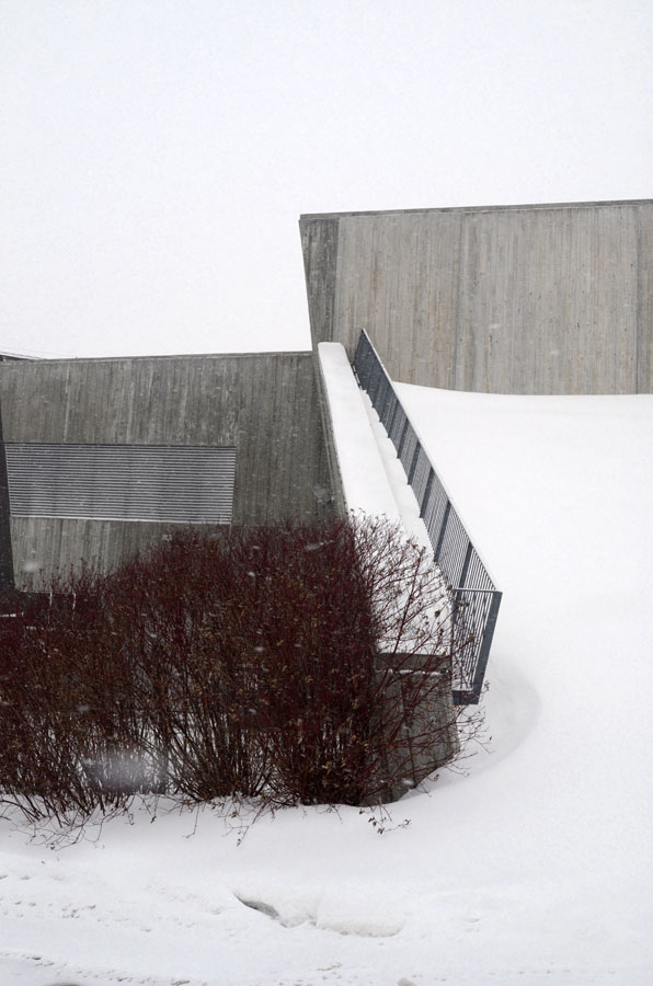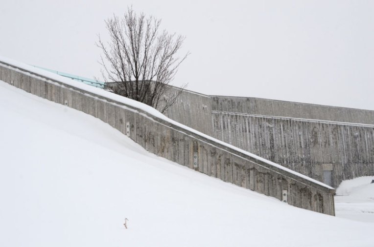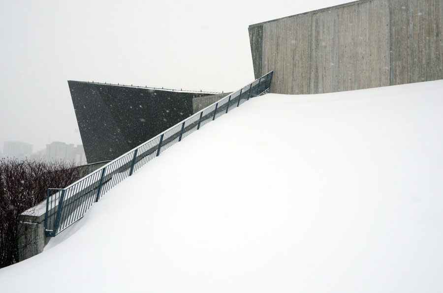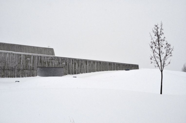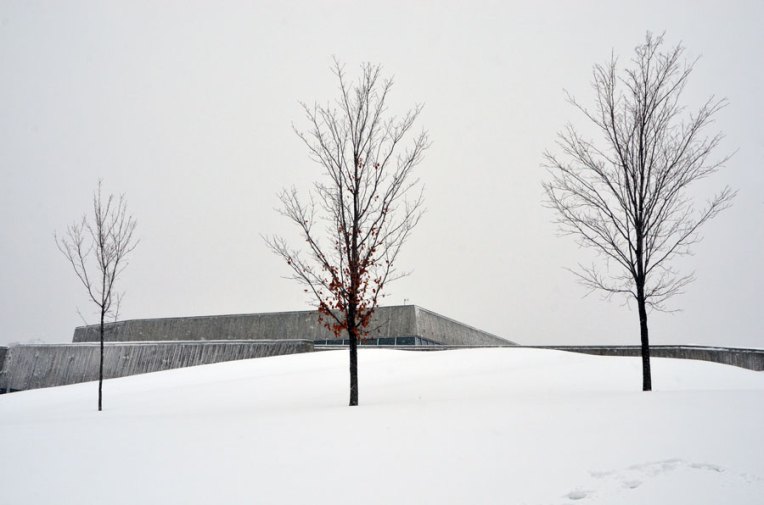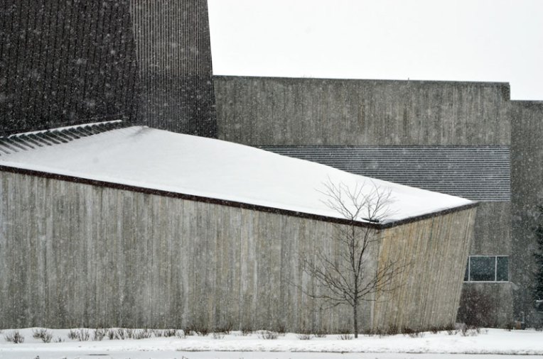 The Canadian War Museum in Ottawa is sustainably designed with the notion of regeneration. At the back it rises gently out of the landscape in some places barely visible. In the summer its green roof sways with approx 10,684 square metres of native grasses further integrating the building into the surroundings. In the winter I love how minimalist it appears from different angles, how the materials used and the cement in particular, soften against the snow. Every angle intriguing.