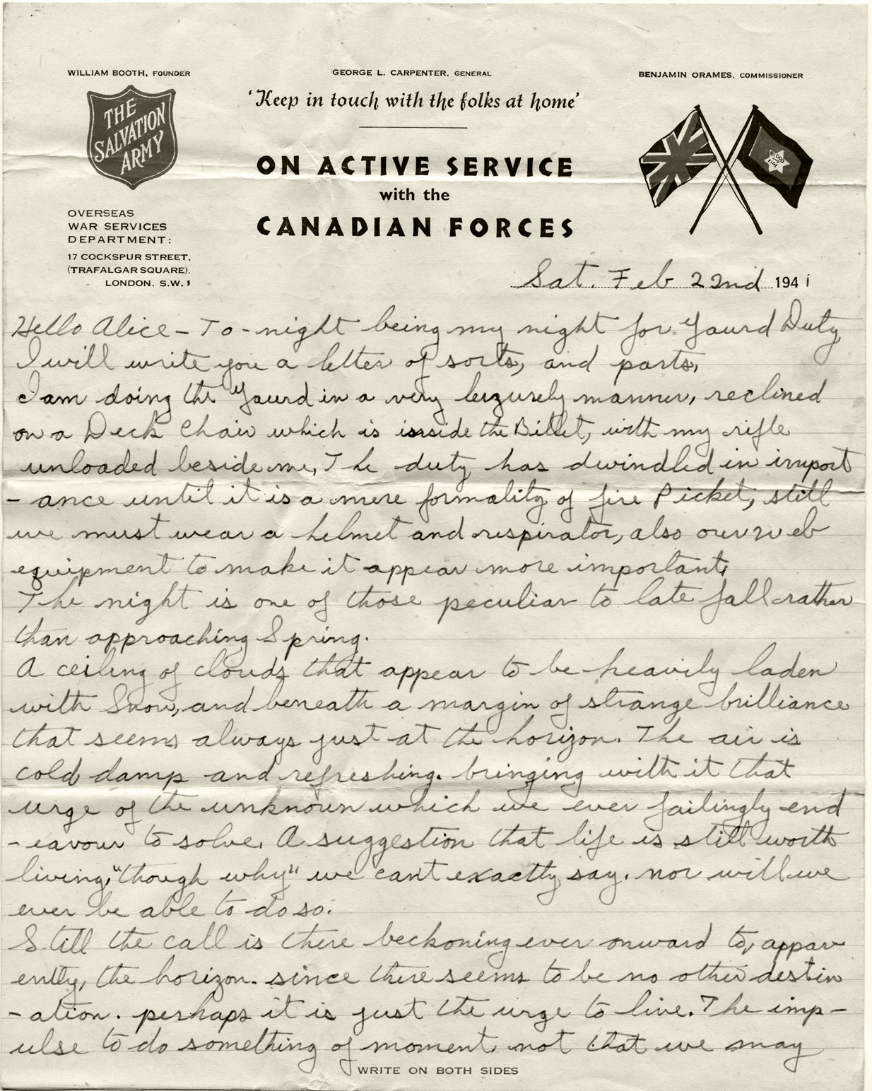 ” The night is one of those peculiar to late fall rather than approaching spring. A ceiling of clouds that appear to be heavily laden with snow, and beneath a margin of strange brilliance that seems always just at the horizon. The air is cold damp and refreshing, bringing with it that urge of the unknown which we ever failingly endeavour to solve, a suggestion that life is still worth living, “though why” we can’t exactly say, nor will we ever be able to do so.