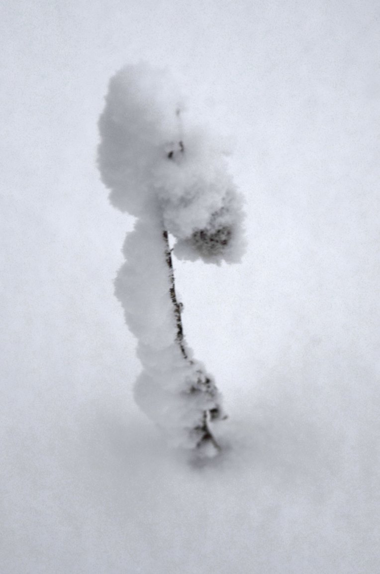 Back to yesterday. Towards the end of the day I was making pictures in low light. They are underexposed and nothing special but somehow they captured that feeling of intimacy that fresh snow seems to evoke. When I looked at them I could picture that snow-covered girl, the one kneeling in the softness trying to steal the last bit of light. Sinking into the fading white on white, pink cheeked, and for a moment, almost graceful.