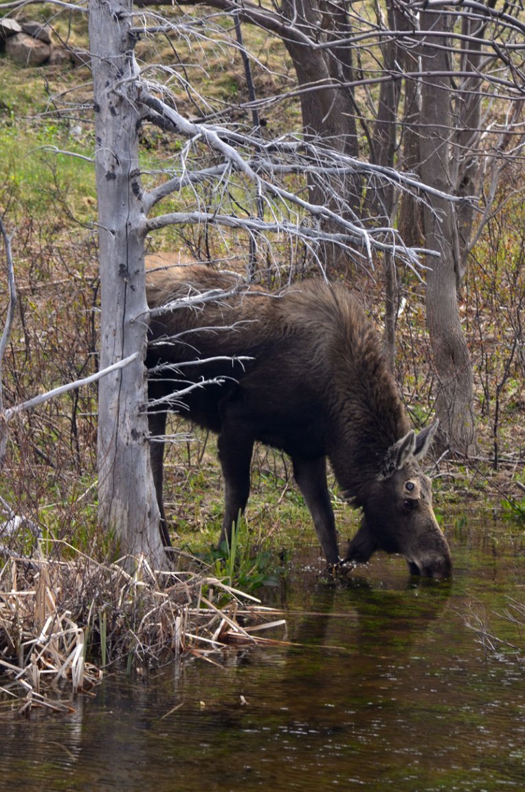 A young male moose stopping to feed at a pond. Note the missing antlers which are shed each fall and regrow in the spring.