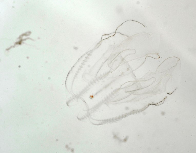 The following images show that same sea jelly in motion. This little Atlantic comb jelly is only about 1cm long. I photographed it with a macro lens, while it was temporarily captured in a bucket. (click on images for a larger view)