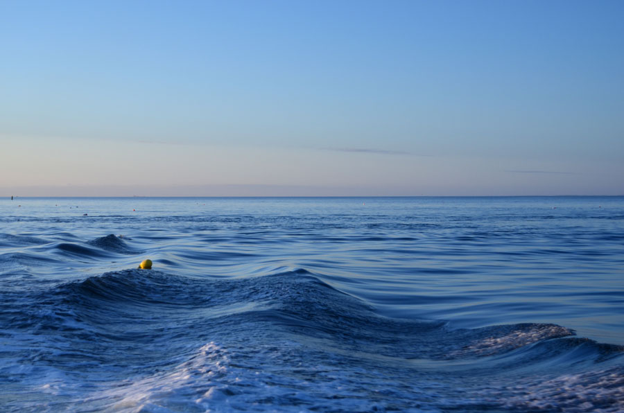 The traps have long ropes and buoys attached allowing the traps to go to the bottom with the buoys marking them for daily retrieval. Each fishing boat has its own unique buoy style. Below: a buoy trailing behind the boat.