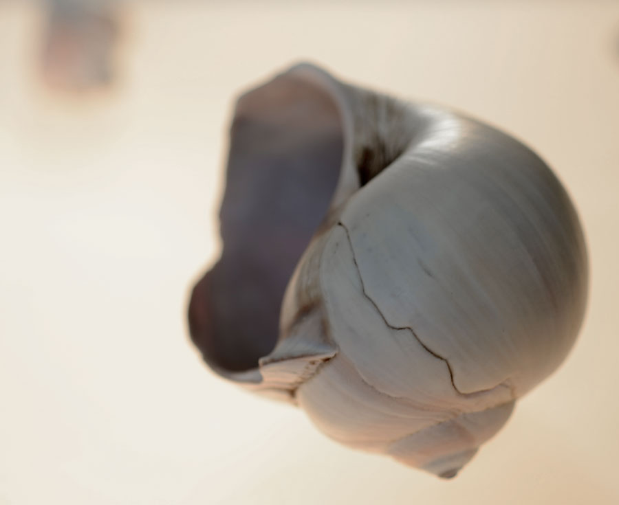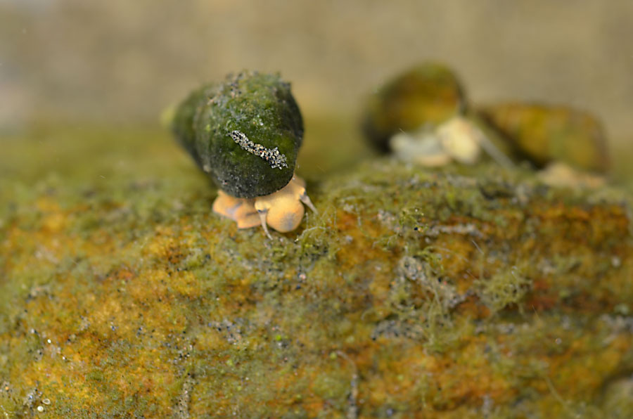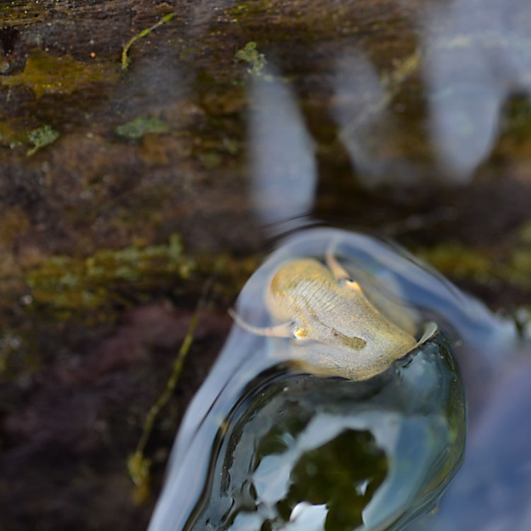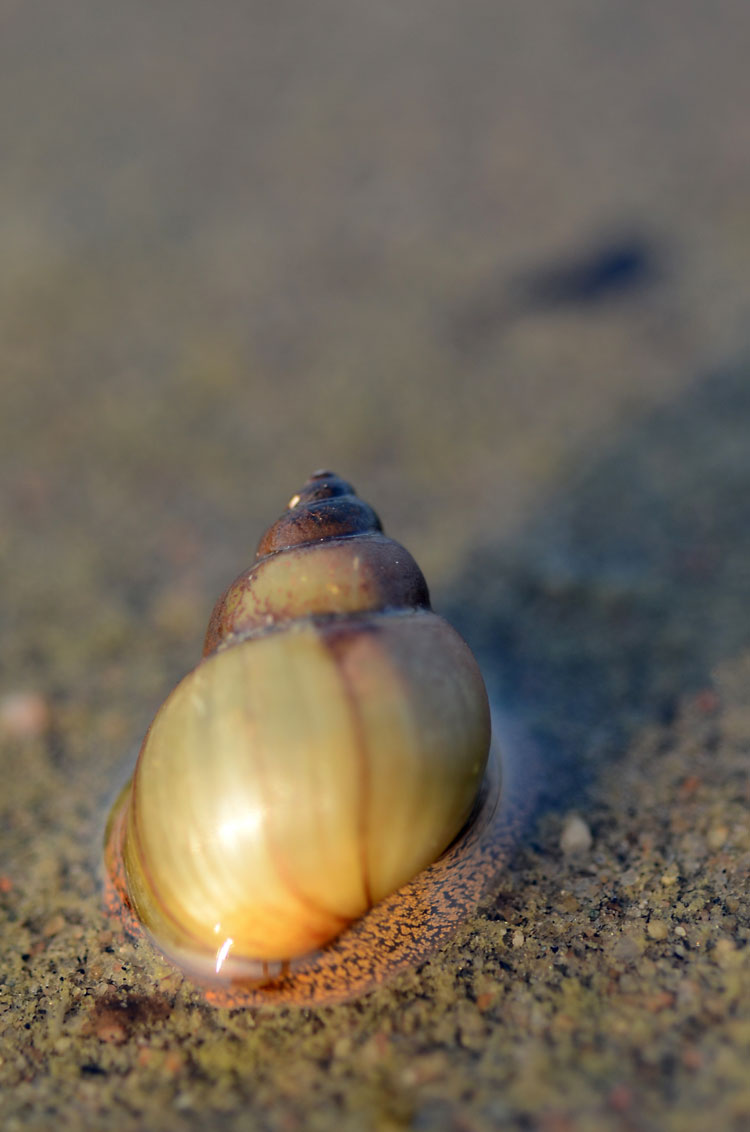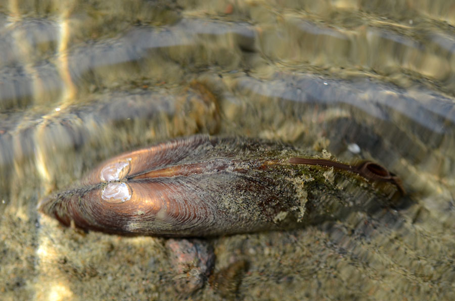 Below: A close up of a freshwater mussel slowly working its way along in the shallow water. Note the oval opening on the right which is covered with small cilia (hair-like structures) for filtering and collecting tiny food particles.