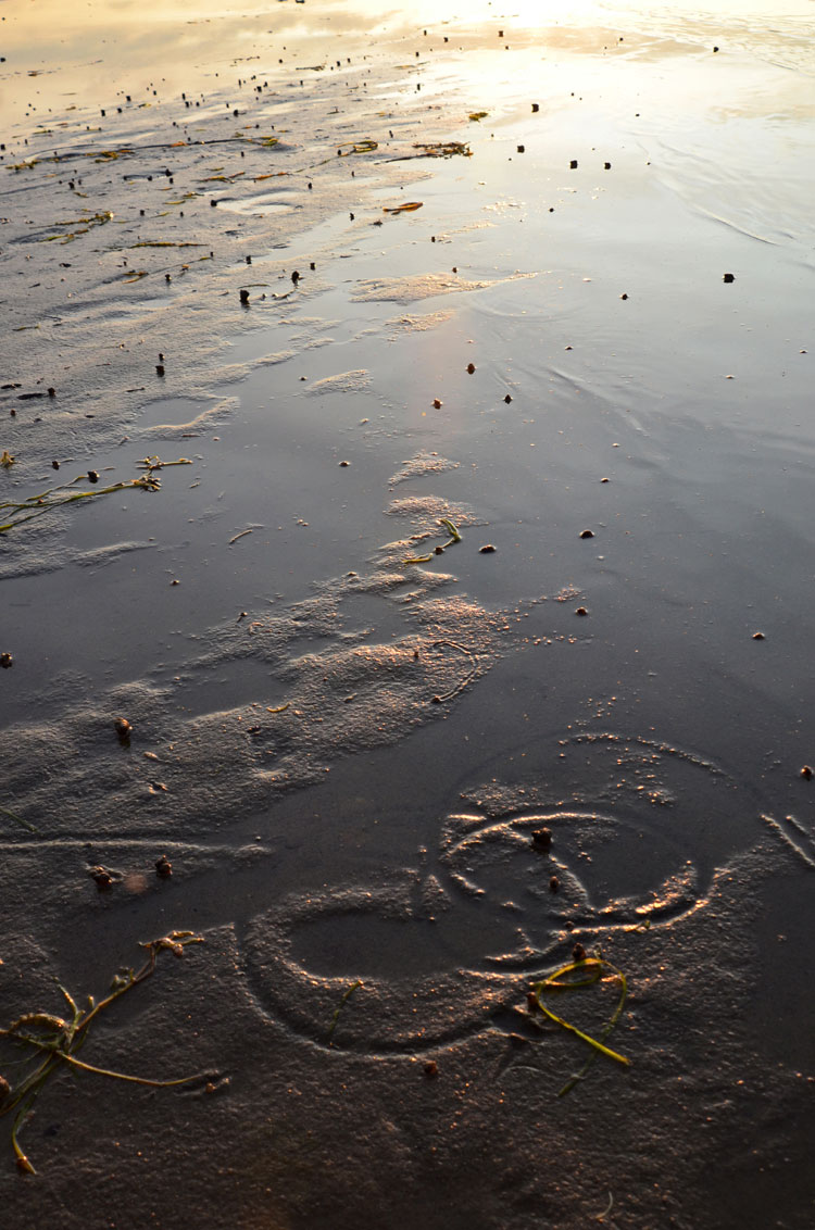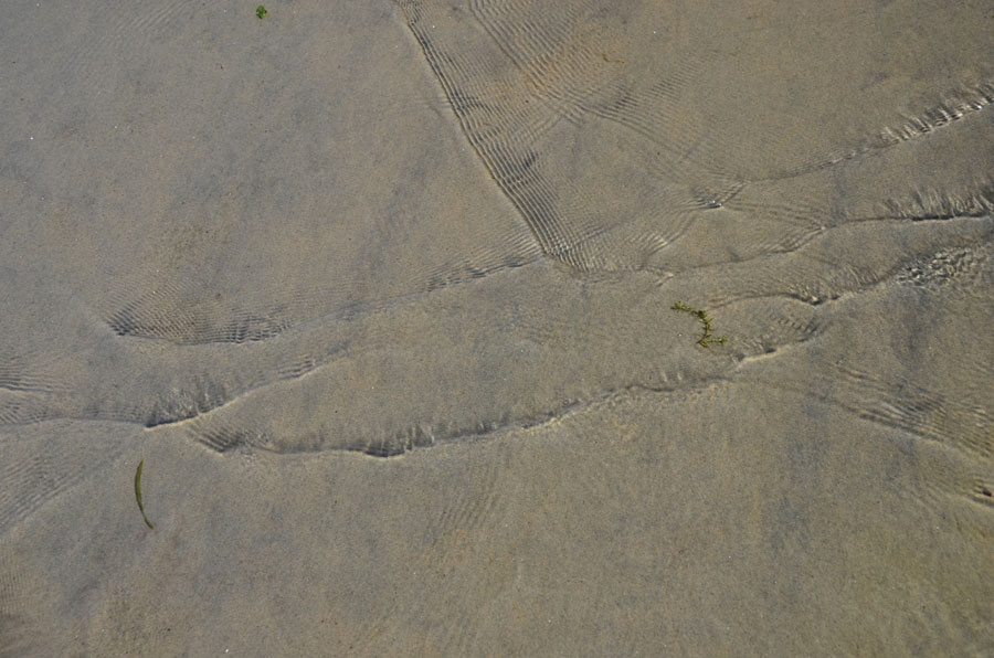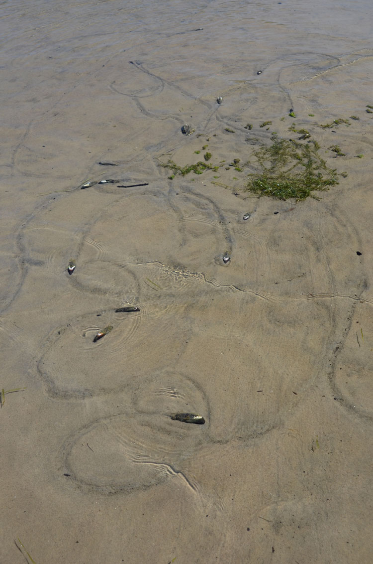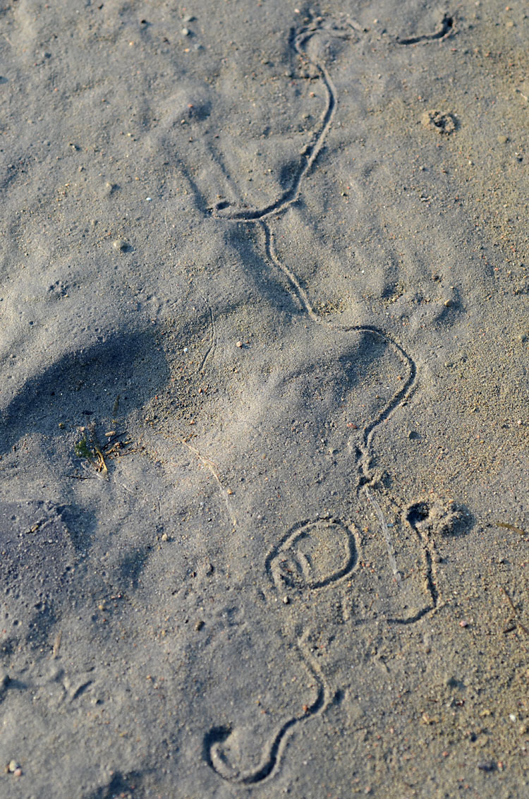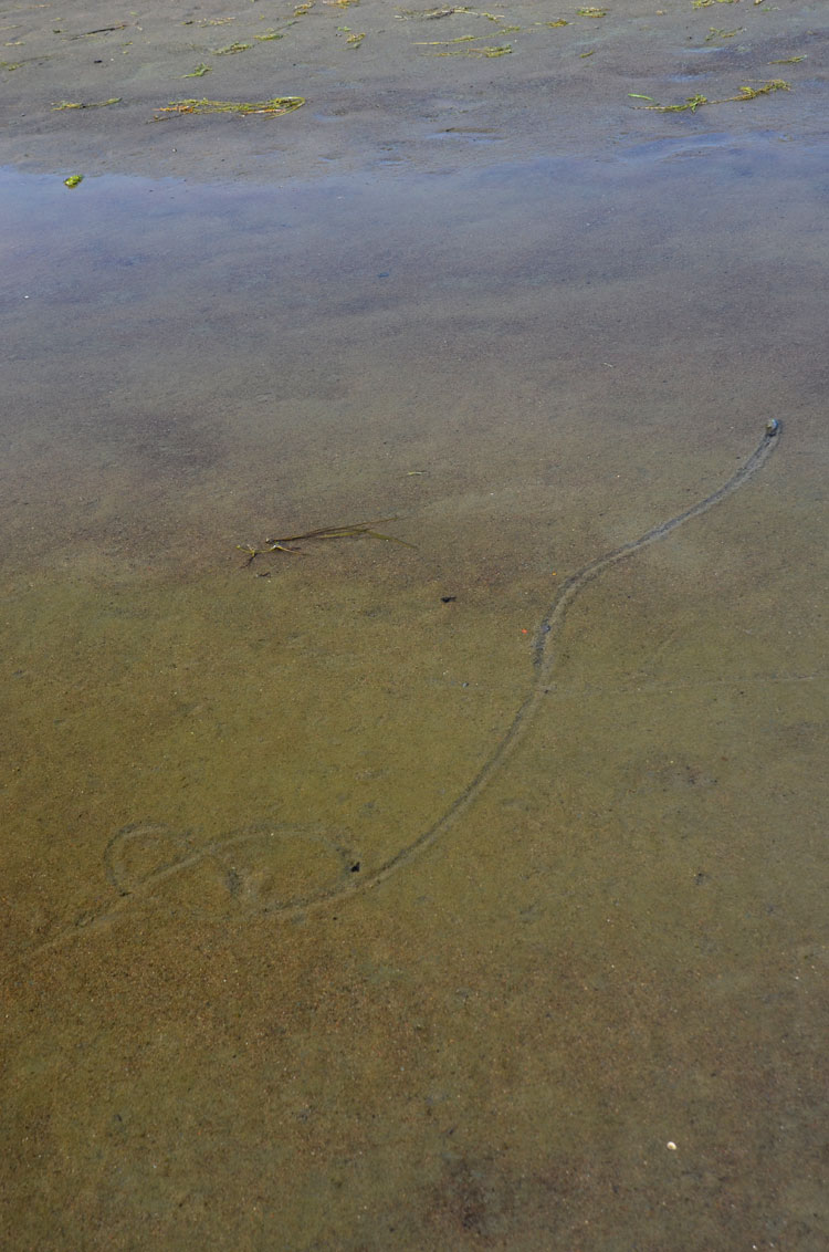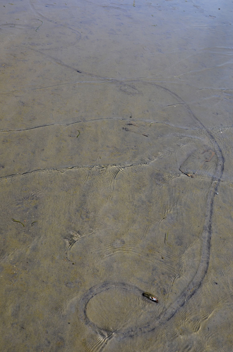 Below: A set of lyrical snail trails, with snails burrowed into the sand at trails end.