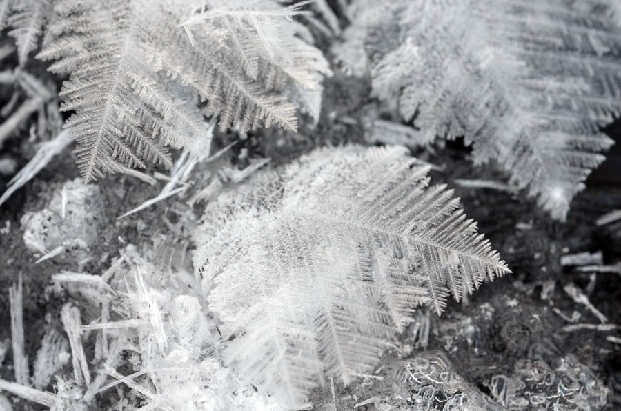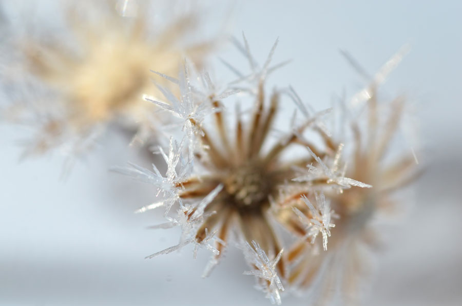 Above and below: Seedheads covered in ice from freezing rain – the patterns develop as the ice starts to melt away and break up into smaller pieces.