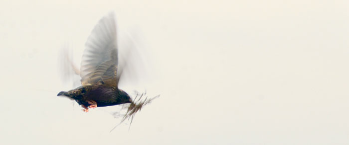 Above: Moving in ~ A Starling in flight, gathering nesting materials