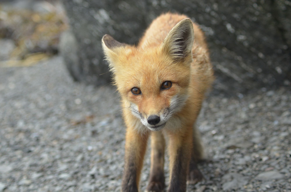Hiking the shoreline of Bic National Park (parc national du Bic) in Quebec, waiting for the water to push out a little further so we are able to pass around boulders and cliffs that are only passable during low tide. While stopped and listening to gently crashing waves and breathing in salty air this little red fox appears from the scattered boulders waiting with us until the water will recede enough for the hike to continue.